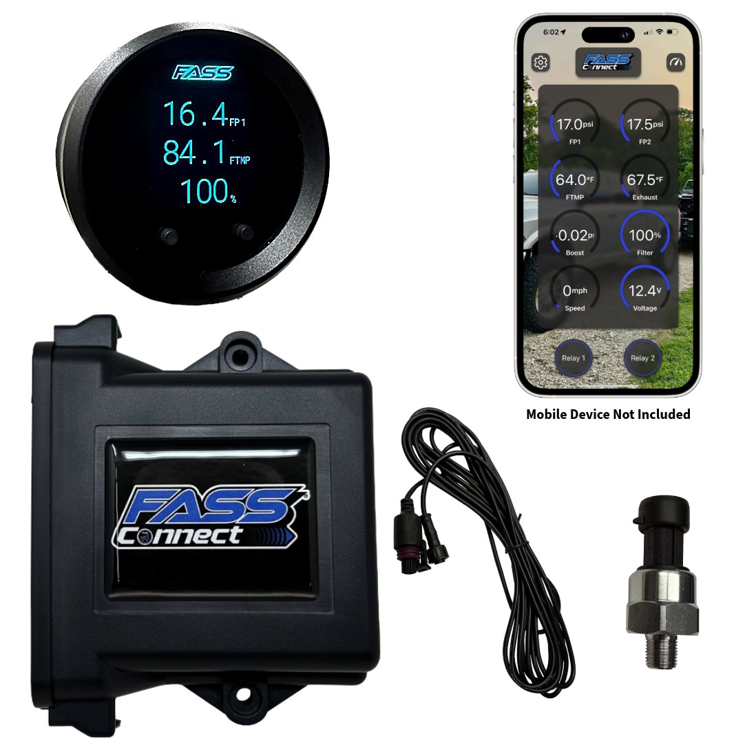 This kit includes the FASS Connect ECU, the FASS Connect Gauge, and a 0–100 PSI fuel pressure sensor (additional sensors are available for purchase as accessories).